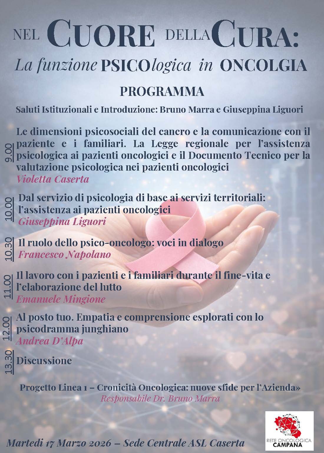 Attraverso il contributo di professionisti del settore, l’incontro intende approfondire il ruolo della psico-oncologia nei diversi setting assistenziali, dalla comunicazione della diagnosi al supporto nel fine vita, fino all’elaborazione del lutto. Particolare attenzione sarà dedicata allo sviluppo dei servizi territoriali, alle normative regionali in materia di assistenza psicologica e agli strumenti operativi per la valutazione e la presa in carico del paziente oncologico.